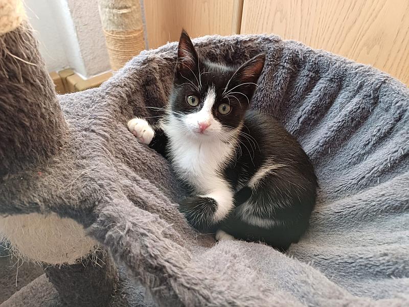 Dort genießt er ein Premiumprogramm, mit Katzenaufzuchtmilch, lecker Essen zwischendurch, ein warmes sicheres Plätzchen,