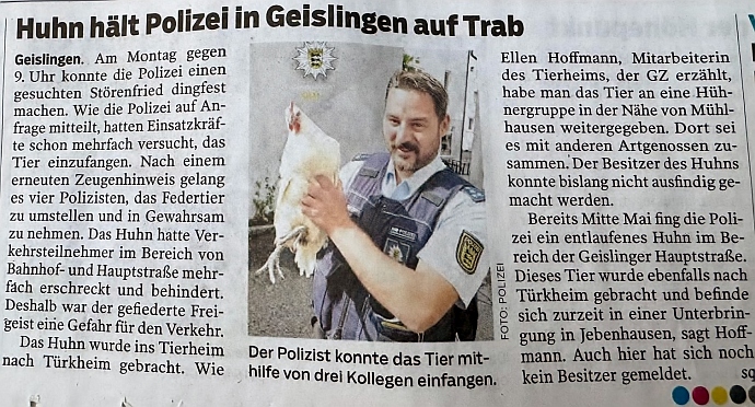 Eine aufregende Hühnerjagd in Geislingen, die sich über einige Wochen hinzog war schliesslich erfolgreich.