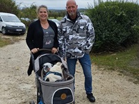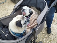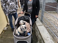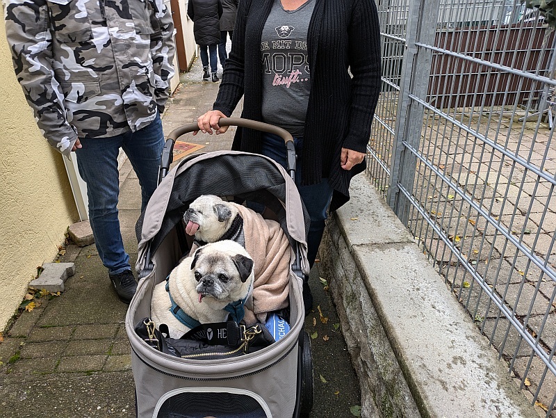 Wie es sich für Möpse gehört, stilgerecht im Mopsmobil, was für die zwei die ja nicht mehr so jung sind und beide schlecht sehen eine schöne Idee ist.