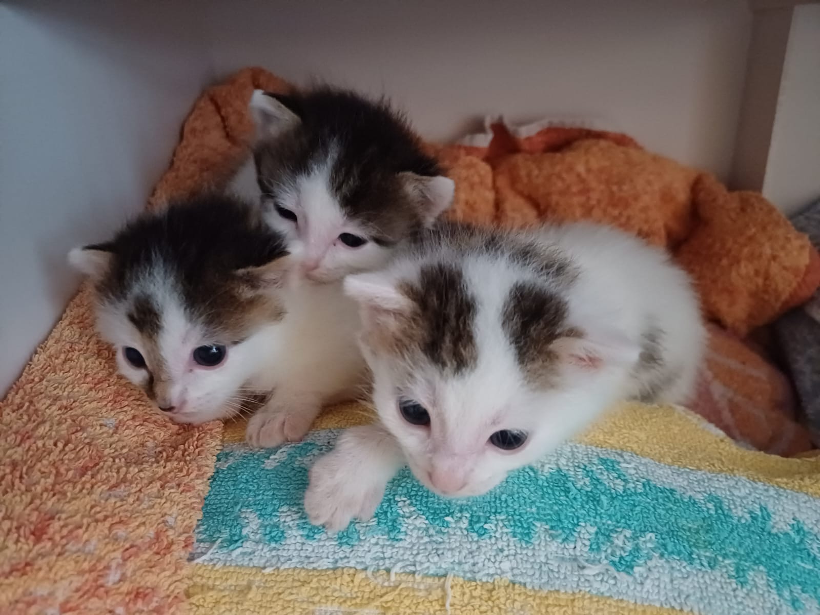 Fee, Flower und Flavio sind ca. 10 Tage alt und brauchen alle 2 Stunden Milch und Bäuchlein streicheln, all die Sachen die eine Mamakatze mit ihren Babys machen würde.