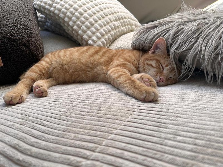 Mir geht`s richtig gut und der riesige Plüschi neben mir ist mein Katerkumpel und mein bester Freund.
