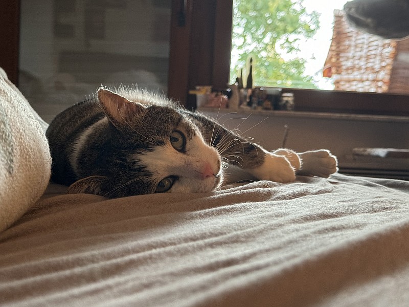 Mittlerweile hat er auch mein Bett als sein Bett eingenommen und kuschelt jede Nacht mit mir.