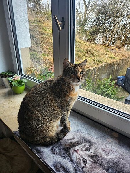 Im Moment ist das Wetter ja nicht so gut, da sitze ich lieber auf der Heizung am Fenster und schau den Vögeln zu, die von meinem Dosenöffner auch immer leckeres Futter bekommen.