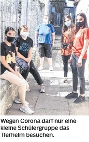 Die Klasse WS 1/2 aus der Kaufmännischen Schule Geislingen hatte im Herbst 2019 unterschiedliche Themen aus dem „Wir lesen" Projekt zur Auswahl. Eigentlich wollten die Schüler im Mai das Tierheim des Tierschutzvereins Geislingen und Umgebung in Türkheim besuchen, doch leider wurde wegen Corona alles auf Juli verschoben. Letzendlich musste die Klasse zusammen mit Deutschlehrerin Lisa Keller stark umplanen, aber eine kleine Gruppe durfte privat sogar das Tierheim besuchen, um einige Bilder zu machen. Die stellvertende Vorsitzende des Tierschutzvereins, Ramona Bergmann zeigte den Schülern die Anlage vor Ort.