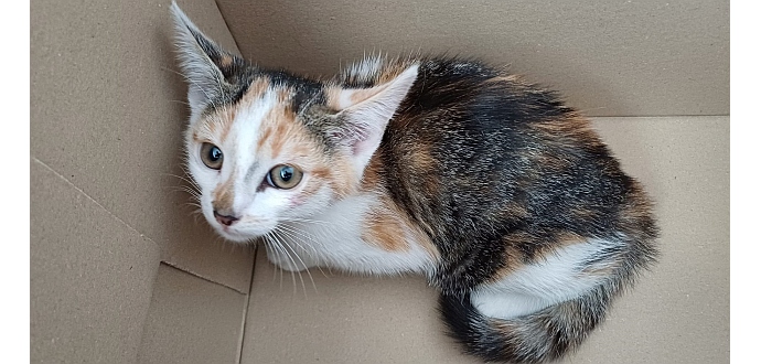 Die kleine Pixie, circa 2 Monate alt, wurde abgemagert und zusammengekauert auf einem Parkplatz eines stark frequentierten Gewerbeareals entdeckt.