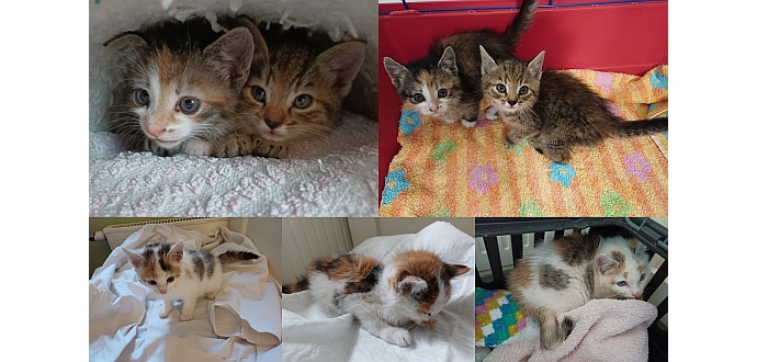 Gerade mal 5 Wochen alt und völlig unterernährt wurden die kleinen Elendshäufchen allein in einer Wiese oder Scheune entdeckt.