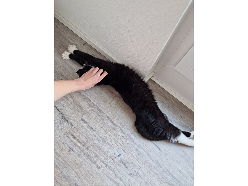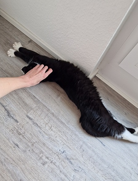 Manchmal kullert er vor lauter Schnurren auf dem Boden herum, weil er das Streicheln so sehr liebt.