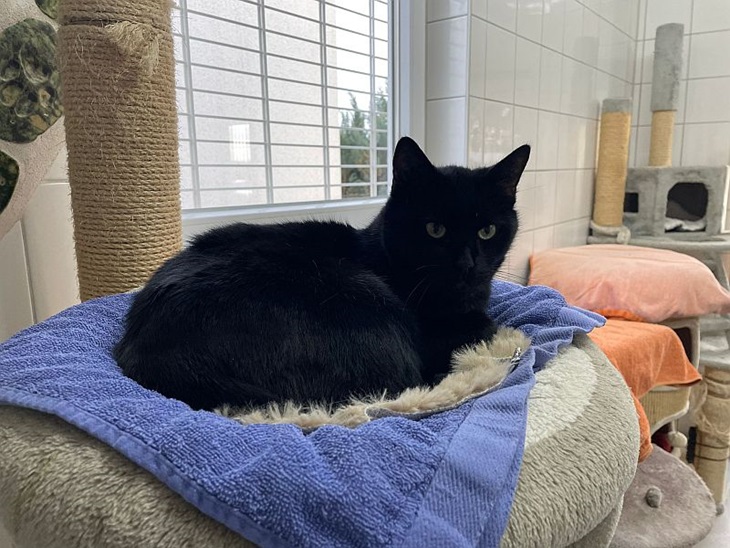 Er sitzt oft im Kratzbaum, ganz gemütlich und kuschelig und beobachtet das Treiben auf dem Boden.