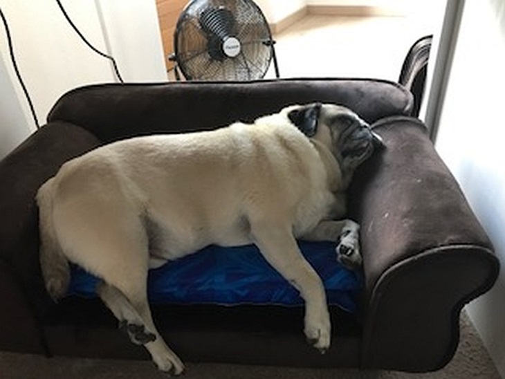 Im HomeOffice lässt es sich gut aushalten: mit der Kühlmatte unter und dem Ventilator hinter sich ….