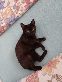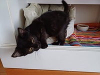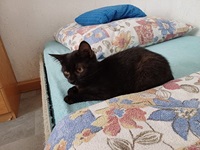 Mittlerweile geht es es Sadie richtig gut, sie hat eine Katzenfreundin und hat entdeckt das es sich im Bett von ihrer Pflegemama ganz wunderbar schlafen lässt.