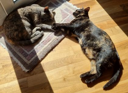 wir sind's Suki (ehemals Billie) und ihre Schwester Juna. Wir möchten euch von unserem neuen Zuhause berichten. Am Anfang waren wir beide sehr schüchtern und hatten kein Vertrauen zu unseren Menschen aber unsere große Katzenschwester die schon vor uns dort gelebt hat, hat es uns leichter gemacht und uns gezeigt, dass wir gar keine Angst vor diesen Menschen haben müssen. Die Neugier und der Spieltrieb waren einfach stärker. Ich (Juna) war auch schon mit meiner großen Katzenschwester draußen auf Entdeckertour. Sie hat immer ein Auge auf mich und ist stets an meiner Seite, schaut dass ich in unserem Revier bleibe und den Weg nach Hause finde. Wir lieben die Haargummis von unserer Menschenmama wir aportieren und schmeißen sie immer durch die ganze Wohnung, sodass sie leider immer verschwinden. Unsere Menschenmama kauft deshalb immer extra Haargummis nur für uns. Wir lieben und genießen die ausgiebigen Streichel- und Kuscheleinheiten die wir bekommen aber ebenso lieben wir das rumtoben miteinander.
