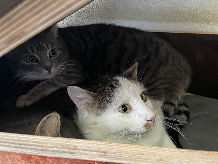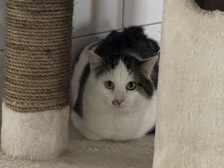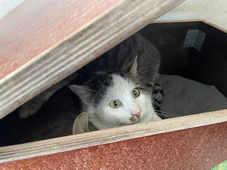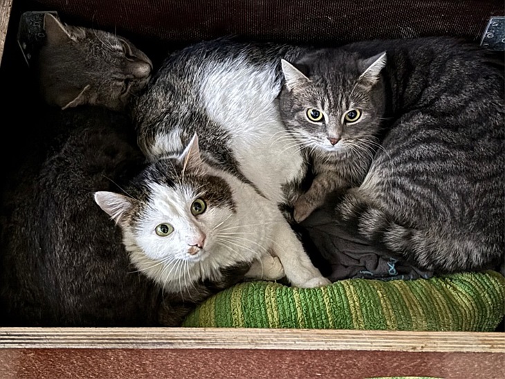 Dort wurde er freundlich aufgenommen und sie sind alle gern zusammen in ihrer " Wildlingskiste" einem Katzenhaus mit Deckel.