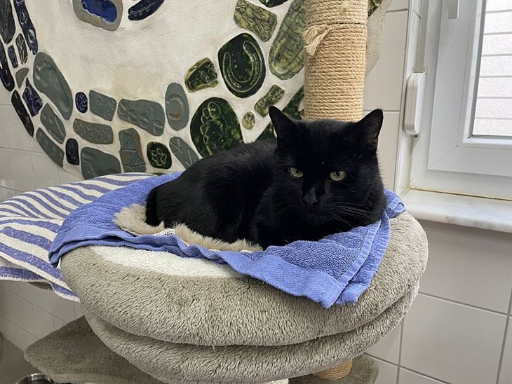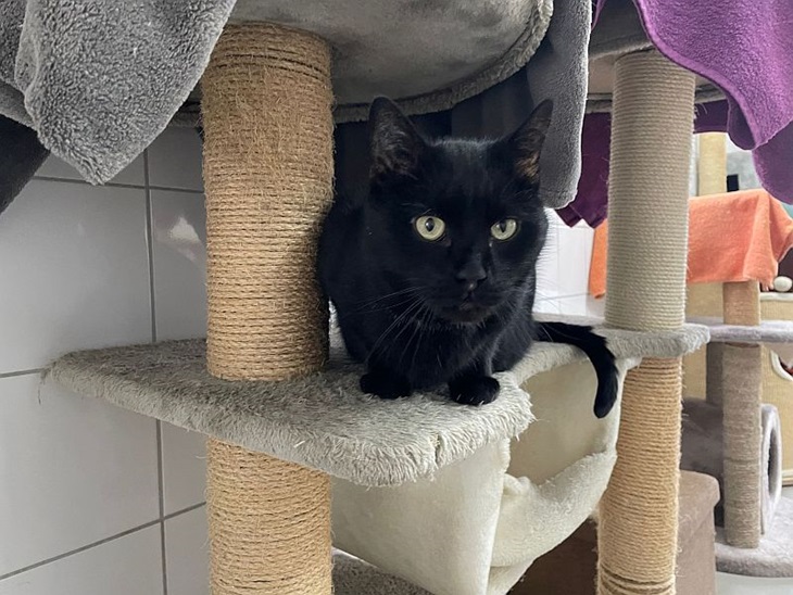 Er sitzt oft im Kratzbaum, ganz gemütlich und kuschelig und beobachtet das Treiben auf dem Boden.